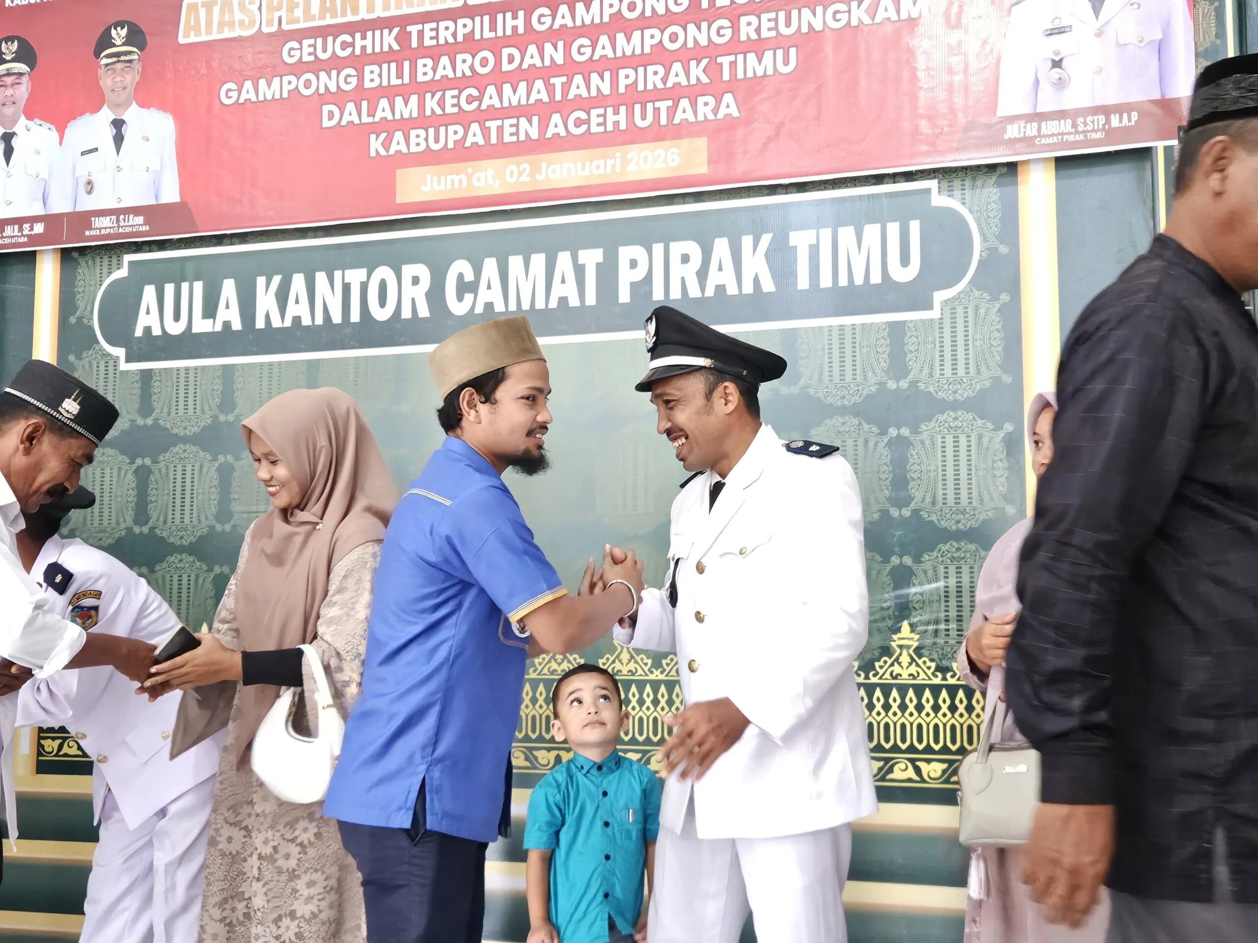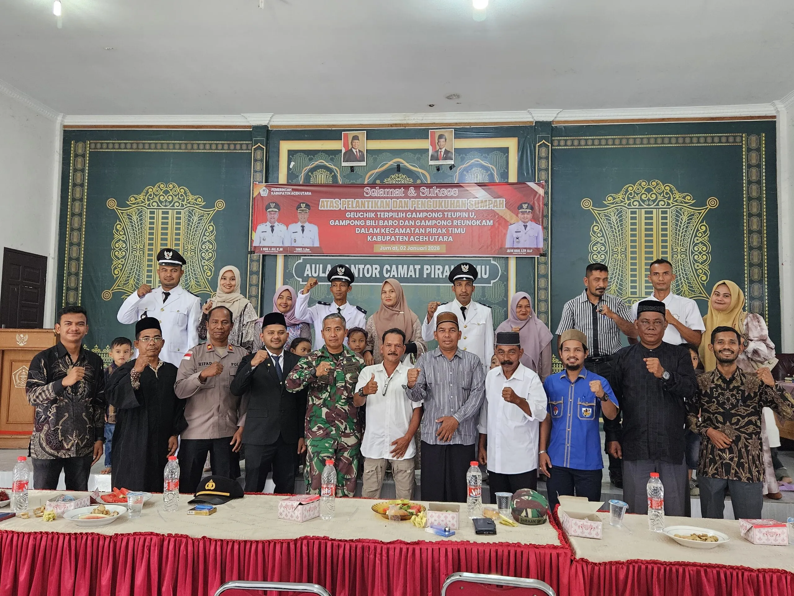 ACEH UTARA – Ketua Dewan Pengurus Kecamatan Komite Nasional Pemuda Indonesia (DPK KNPI) Pirak Timu, Tgk. Aris Munandar, menghadiri upacara pelantikan dan pengambilan sumpah jabatan tiga Kepala Desa (Geuchik) definitif di lingkungan Kecamatan Pirak Timu, Kabupaten Aceh Utara, Jumat (02/01/2026).